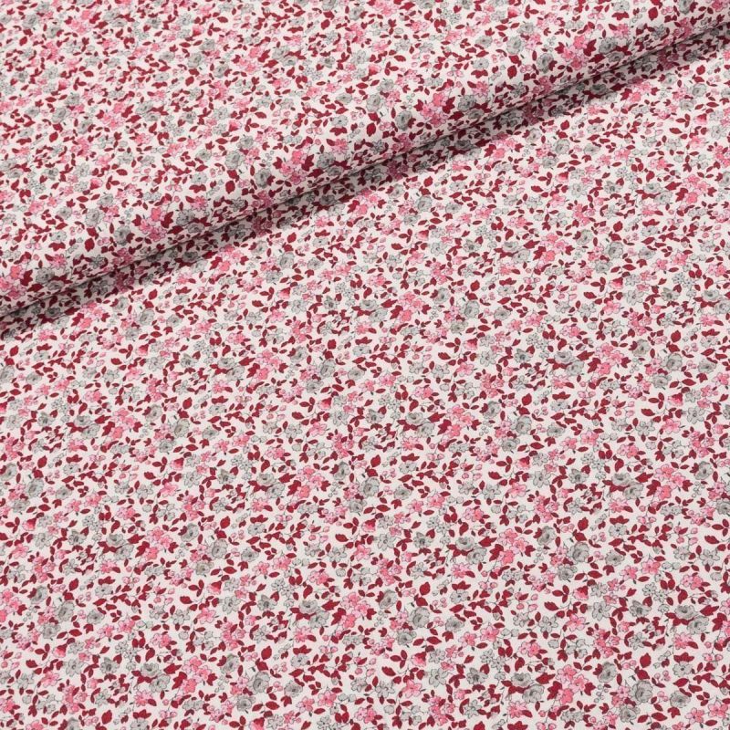 Bavlněná látka (tkanina) se vzorem šedých a růžových kytiček na bílém podkladu. Látka je v šířce 160 cm, vyrobena ze 100% bavlny (gramáž 135g/m2) v pl...