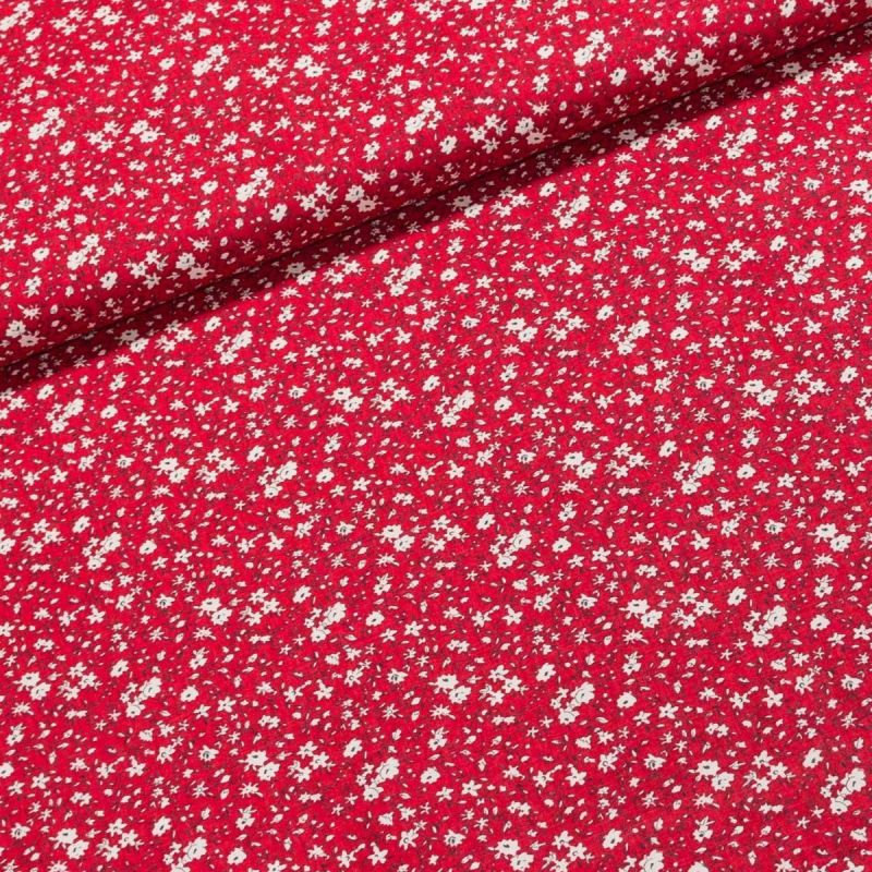 Bavlněná látka (tkanina) se vzorem bílých kytiček na červeném podkladu. Látka je v šířce 160 cm, vyrobena ze 100% bavlny (gramáž 135g/m2) v plátnové vazbě. Vzor látky je natištěn jen z jedné strany z druhé strany je látka bez potisku.
