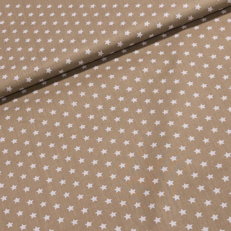 Bavlněná látka (tkanina) s motivem bílých hvězdiček na béžovém podkladě. Látka je v šířce 140 cm, vyrobena ze 100% bavlny (gramáž 135g/m2) v plátnové vazbě. Vzor látky je natištěn jen z jedné strany z druhé strany je látka bez potisku.