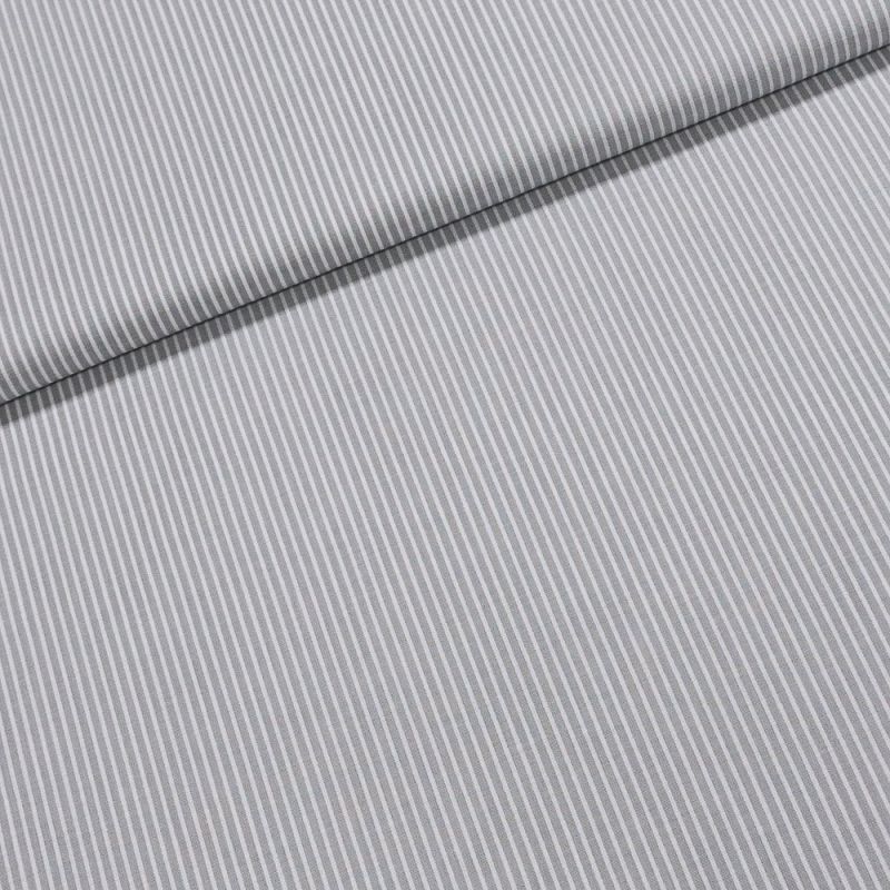 Bavlněná látka (tkanina) s motivem bílých a šedých úzkých proužků 2 mm. Látka je v šířce 150 cm, vyrobena ze 100% bavlny (gramáž 135g/m2) v plátnové vazbě a je potištěná jen z jedné strany z druhé je bez potisku.