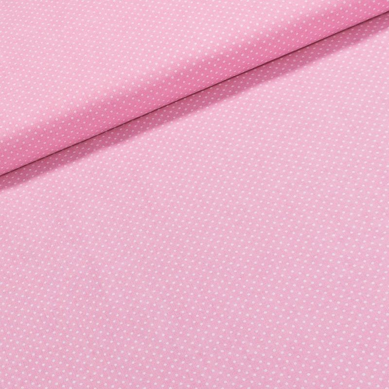Bavlněná látka (tkanina) s motivem bílých puntíků 2 mm na růžovém pozadí. Látka je v šířce 150 cm, vyrobena ze 100% bavlny (gramáž 135g/m2) v plátnové vazbě a je potištěná jen z jedné strany z druhé je bez potisku.