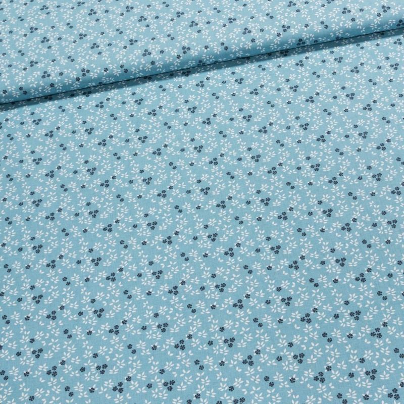 Bavlněná látka (tkanina) se vzorem tmavě modrých kvíteček s bílými lístky na tyrkysovém podkladu. Látka je v šířce 140 cm, vyrobena ze 100% bavlny (gramáž 135g/m2) v plátnové vazbě. Vzor látky je natištěn jen z jedné strany z druhé strany je látka bez potisku.