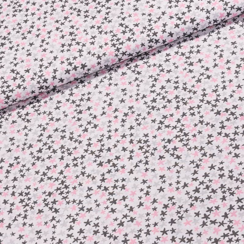 Bavlněná látka (tkanina) se vzorem růžových, černých a šedých hvězdiček na bílém podkladu. Látka je v šířce 140 cm, vyrobena ze 100% bavlny (gramáž 13...