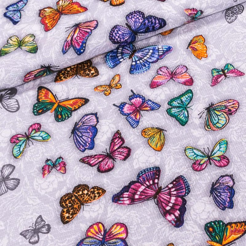 Bavlněná látka (tkanina) štola nebo také utěrkovina na metráž se vzorem barevných motýlů na šedém podkladu. Látka je v šířce 50 cm, vyrobena ze 100% b...