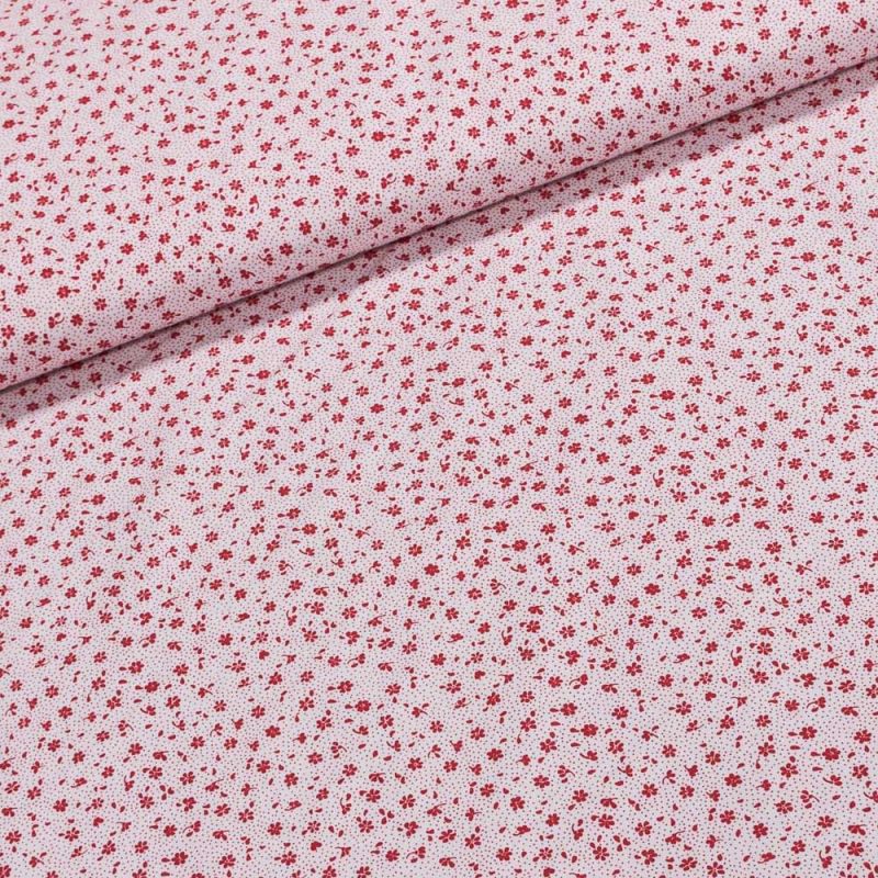 Bavlněná látka (tkanina) s motivem červených květinek na bílé. Látka je v šířce 160 cm, vyrobena ze 100% bavlny (gramáž 135g/m2) v plátnové vazbě. Vzor látky je natištěn jen z jedné strany z druhé strany je látka bez potisku.