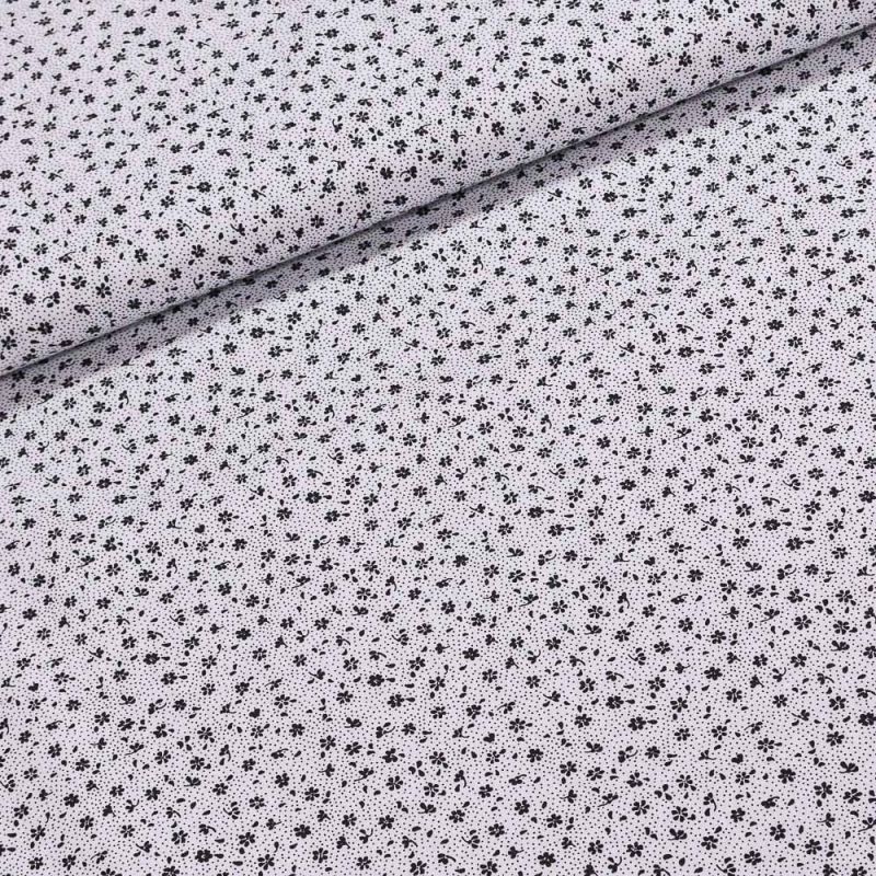 Bavlněná látka (tkanina) s motivem černých květinek na bílé. Látka je v šířce 160 cm, vyrobena ze 100% bavlny (gramáž 135g/m2) v plátnové vazbě. Vzor látky je natištěn jen z jedné strany z druhé strany je látka bez potisku.