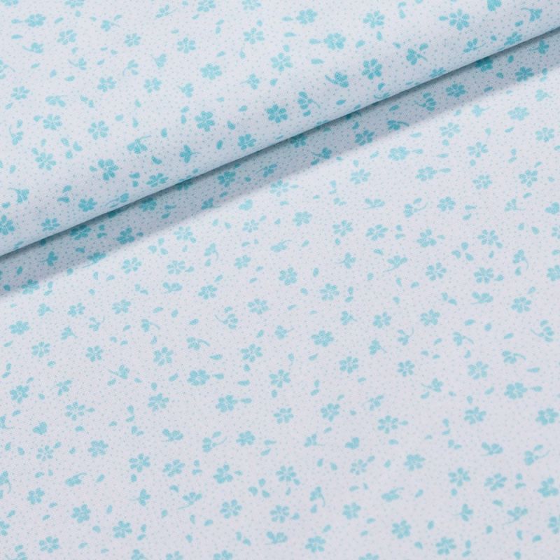 Bavlněná látka (tkanina) s motivem tyrkysových květinek na bílé. Látka je v šířce 160 cm, vyrobena ze 100% bavlny (gramáž 135g/m2) v plátnové vazbě. Vzor látky je natištěn jen z jedné strany z druhé strany je látka bez potisku.