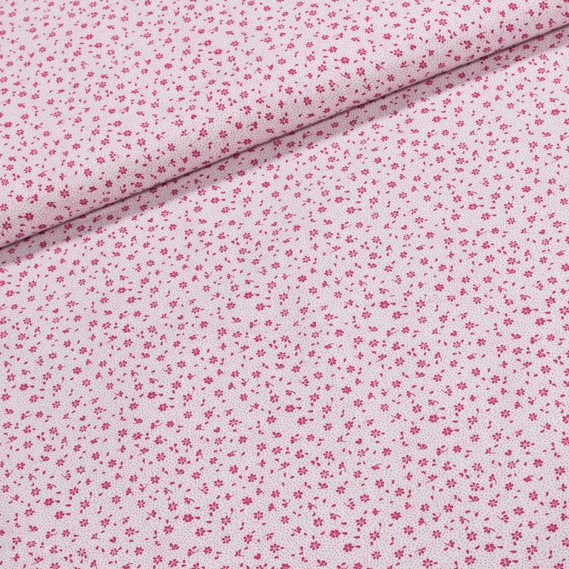 Bavlněná látka (tkanina) s motivem sytě růžových květinek na bílé. Látka je v šířce 160 cm, vyrobena ze 100% bavlny (gramáž 135g/m2) v plátnové vazbě. Vzor látky je natištěn jen z jedné strany z druhé strany je látka bez potisku.
