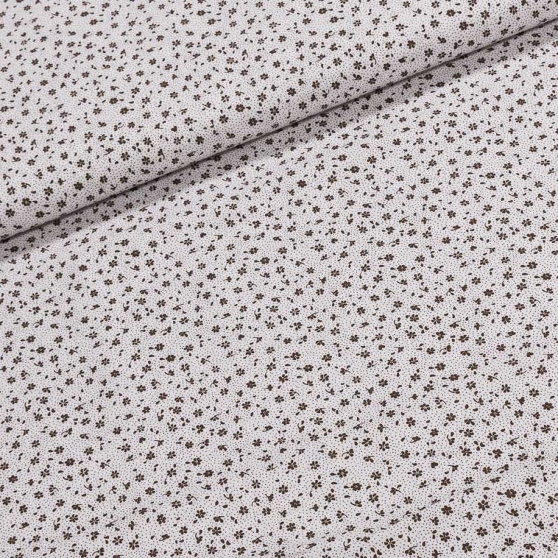 Bavlněná látka (tkanina) s motivem hnědých květinek na bílé. Látka je v šířce 160 cm, vyrobena ze 100% bavlny (gramáž 135g/m2) v plátnové vazbě. Vzor látky je natištěn jen z jedné strany z druhé strany je látka bez potisku.
