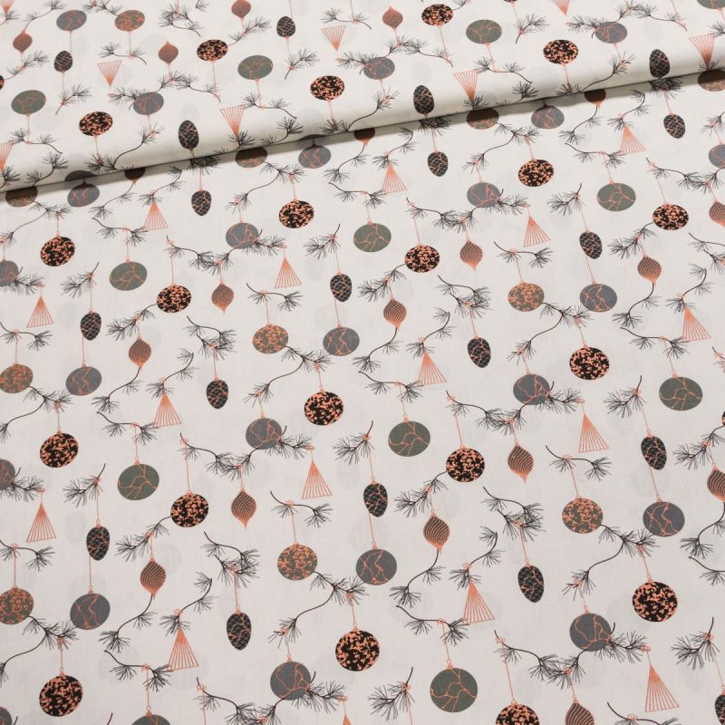 Bavlněná látka (tkanina) se vzorem lososově a šedě zbarvených baněk na stromeček na smetanovém podkladu. Látka je v šířce 140 cm, vyrobena ze 100% bavlny (gramáž 120g/m2) v jemné plátnové vazbě. Vzor látky je natištěn jen z jedné strany z druhé strany je látka bez potisku.
