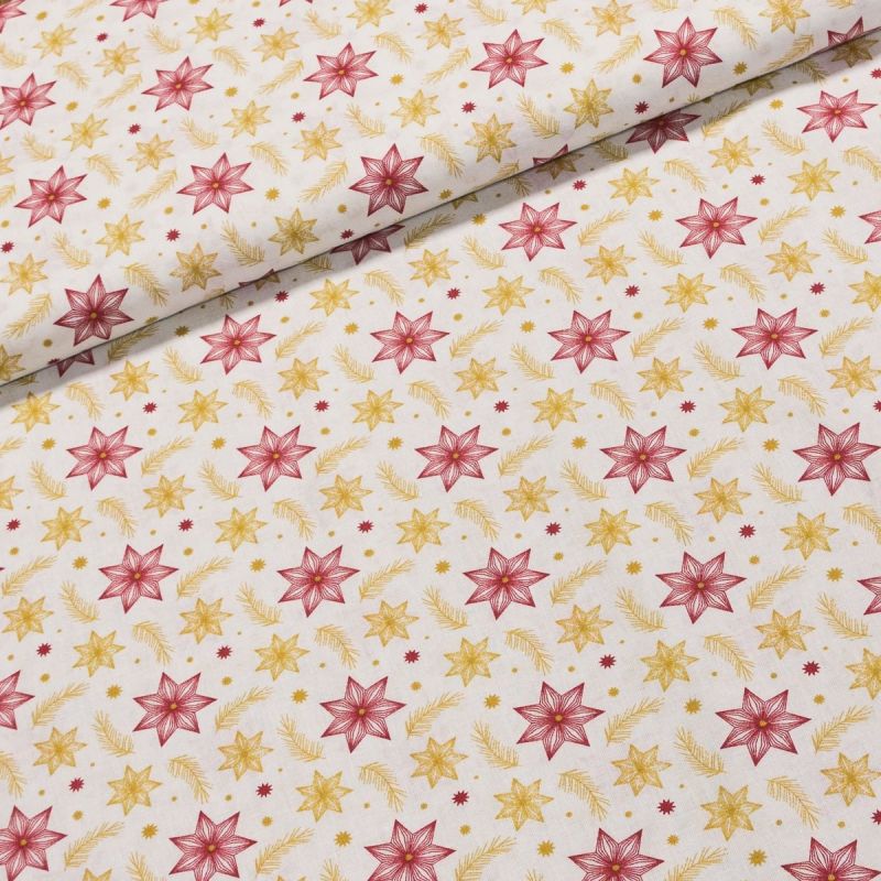 Bavlněná látka (tkanina) se vzorem červených a zlatých hvězd s větvičkami na bílém pozadí. Látka je v šířce 140 cm, vyrobena ze 100% bavlny (gramáž 13...
