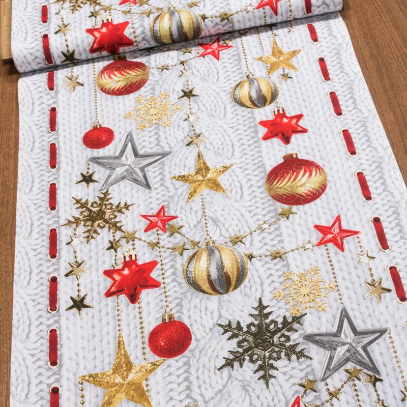 Bavlněná látka (tkanina) štola na metráž se vzorem vánoční dekorace a hvězd na šedém vzoru pleteniny. Látka je v šířce 50 cm, vyrobena ze 100% bavlny (gramáž 230g/m2) v plátnové vazbě. Látku lze použít na vánoční stůl jako jeden středový pruh nebo dva pruhy na šířku stolu nahrazující prostírání. Vzor látky je natištěn jen z jedné strany z druhé strany je látka bez potisku.