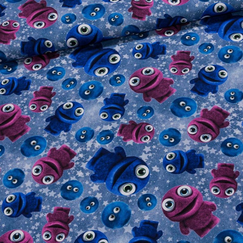 Elastický úplet (jersey) se vzorem modrých a růžových smajlíků na modrém pozadí s hvězdičkami. Látka je v šířce 180 cm, vyrobena ze 95% bavlny a 5% elastanu (gramáž 200g/m2). Látka je vhodná na tepláky, mikiny, čepice či nákrčníky. Látka má vzor z jedné strany z druhé je bez potisku.