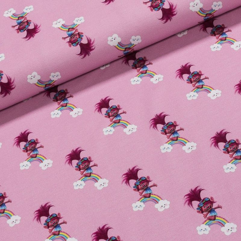 Bavlněný úplet dětský TEPLÁKOVINA 7101-001 TROLLS, skřitci a duha na růžové, š.145cm (látka v metráži)