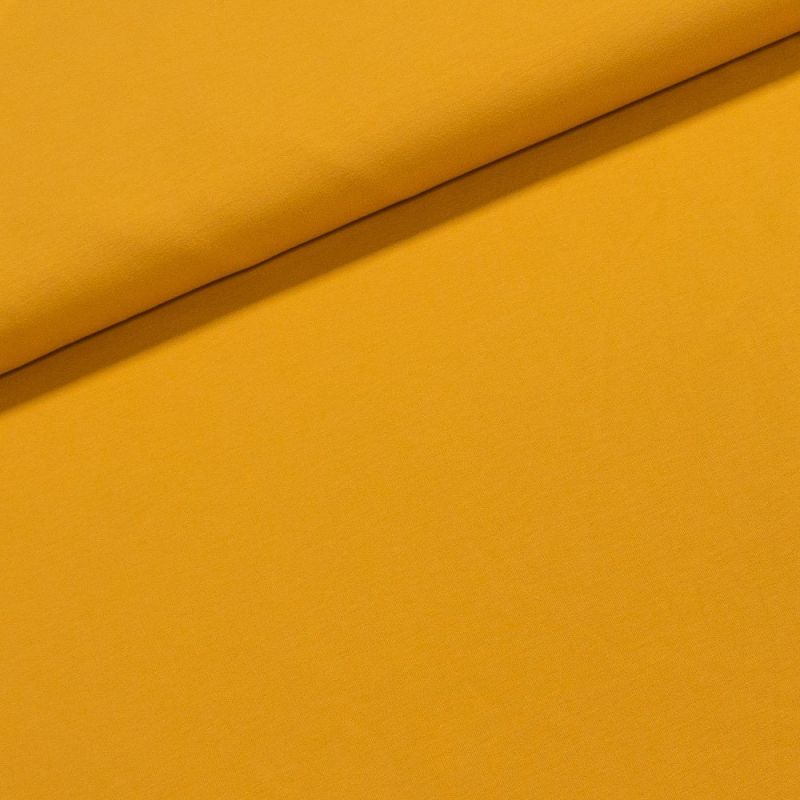 Elastický bavlněný úplet (jersey) v jednobarevné hořčicové barvě. Je vyroben z 95% bavlny a 5% elastanu (gramáž 210g/m2). Látka je v šířce 185 cm a je z obou stran stejná.