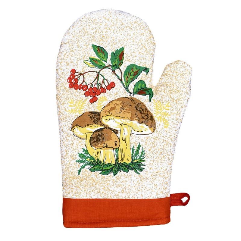 Kuchyňská chňapka (rukavice) se vzorem hub v teracotovém provedení. Chňapka má všitý magnet a poutko na zavěšení. Chňapka je v rozměru 28x18cm a je vy...