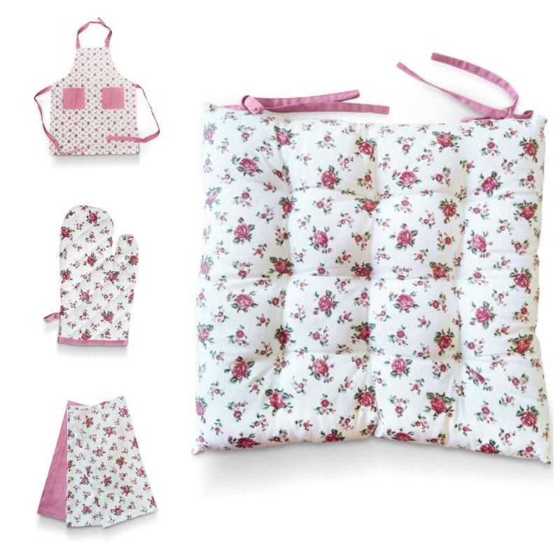 Kuchyňská sada s motivy růžových květinek na bílém pozadí. Kuchyňský set může obsahovat zástěru, utěrky, různé rozměry ubrusů, prostírání, sedáky, pol...