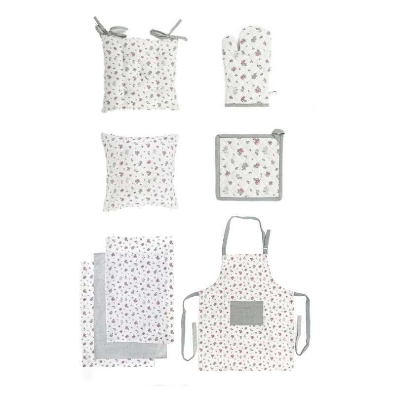 Kuchyňská sada s motivy růžovo-šedých kytiček. Kuchyňský set může obsahovat zástěru, utěrky, sedáky, polštářky, chňapky a další. Co bude Vaše kuchyňsk...