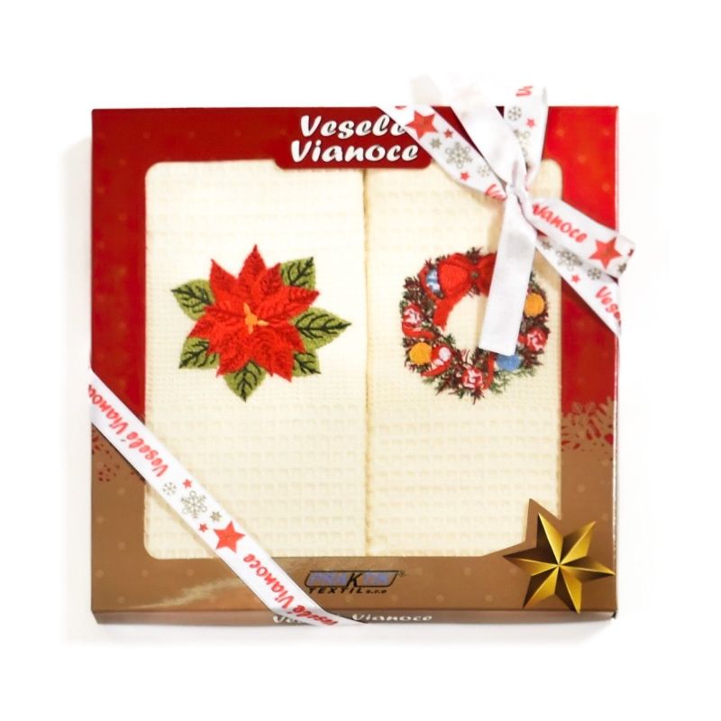 Utěrka KIARA VÁNOCE 59 vaflová vyšívaná, dárkové balení, věneček, vánoční růže na smetanové, 2 kusy 50x70cm