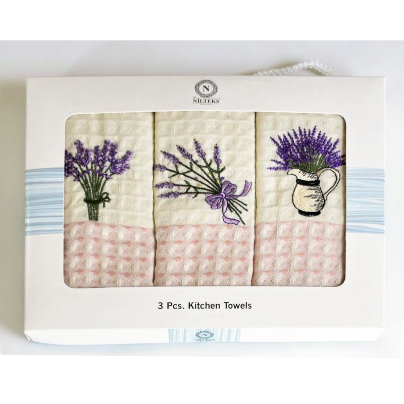 Bavlněné vaflové utěrky s motivem levandule na smetanovo-světle růžovém podkladu. Balení obsahuje 3 kusy utěrek v rozměru 50x70cm. Utěrky jsou baleny v ozdobné dárkové krabičce a jsou vyrobeny ze 100% bavlny.