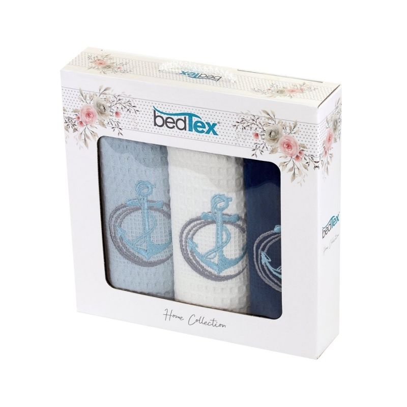 Bavlněné vaflové utěrky s motivem vyšívaných lodních kotev v modrých barvách. Balení obsahuje 3 kusy utěrek v rozměru 40x60cm. Utěrky jsou baleny v ozdobné dárkové krabičce a jsou vyrobeny ze 100% bavlny.