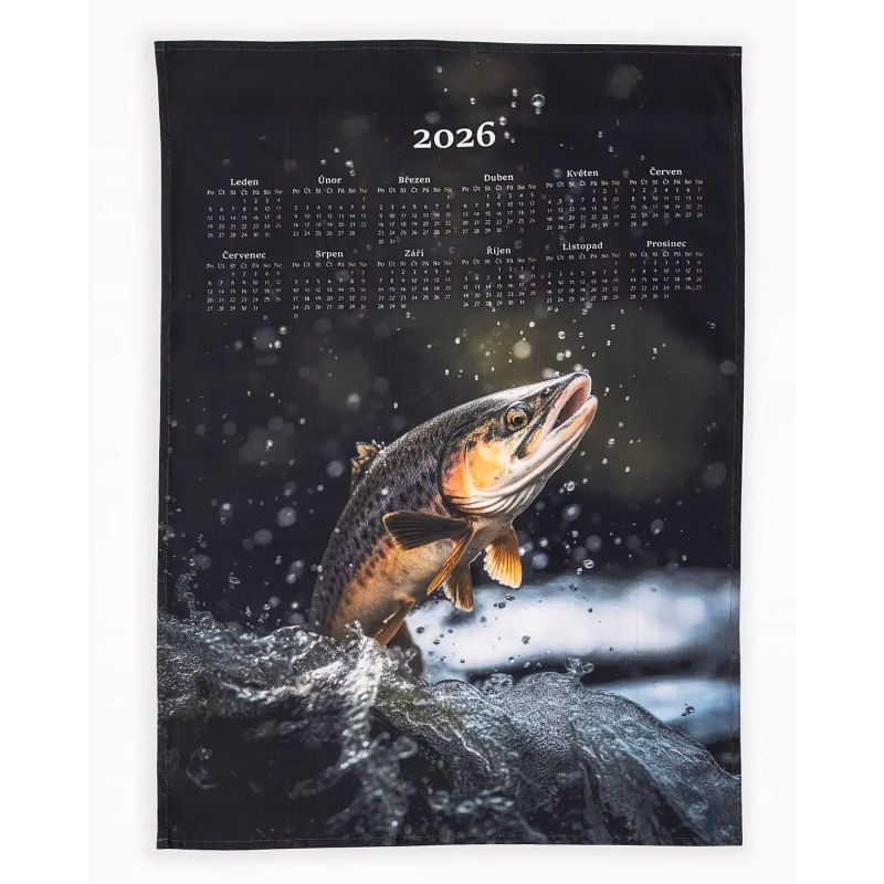 Bavlněný textilní kalendář pro rok 2026 s motivem pstruha v tmavě šedo-zeleném provedení v rozměru 50x70cm. Kalendář poté může sloužit i jako kuchyňsk...