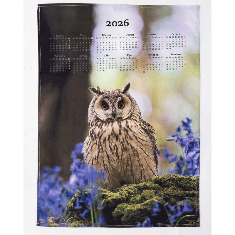 Textilní kalendář, utěrka SOVA 2026, hnědý, 50x70cm, bez hůlky