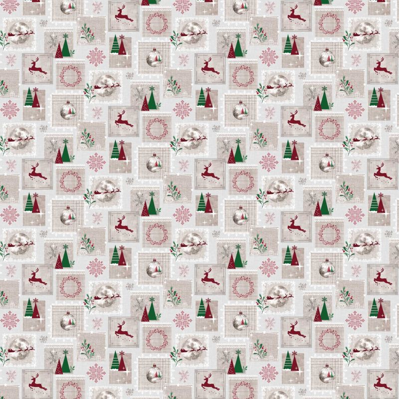 Omyvatelná PVC ubrusovina s podkladem z netkané textilie s vánočním vzorem jelínků, vánočních ozdob a stromečků ve čtvercích v červeno-zelených barvá...