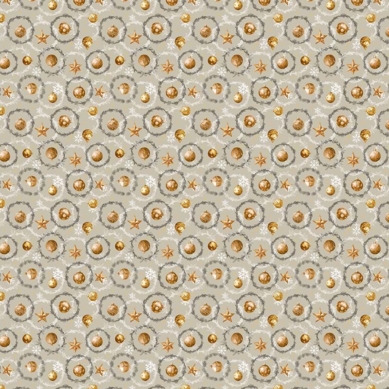 Omyvatelná PVC ubrusovina s podkladem z netkané textilie se vzorem zlatých vánočních ozdob na šedém pozadí s hladkým povrchem. Ubrus je dostupný v metráži o šířce 140cm.
