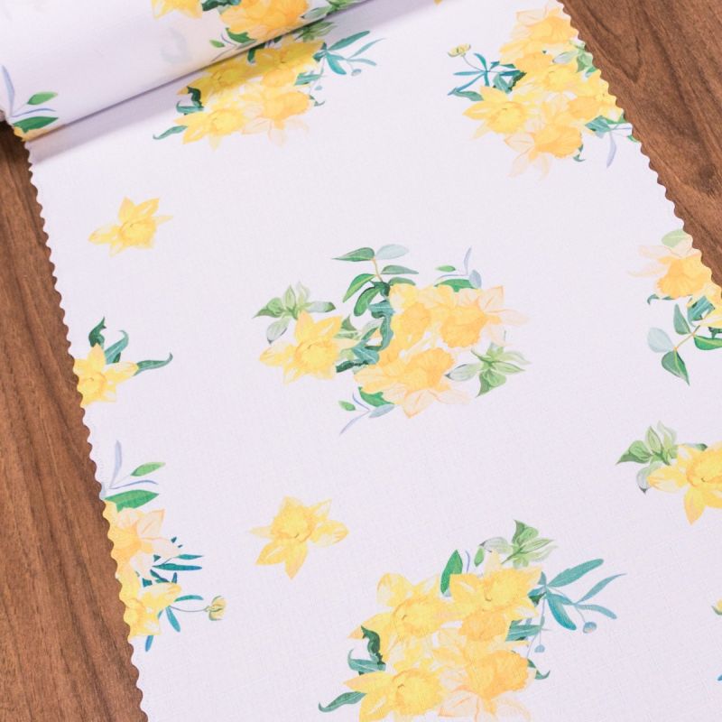 Látková ubrusovina / štola s vodoodpudivou teflonovou vrstvou s jarním vzorem narcisek na bílém podkladu s vlnkovanými okraji. Díky teflonové vrstvě s...