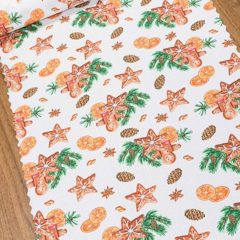 Látková ubrusovina / štola s vodoodpudivou teflonovou vrstvou motivem perníčků v oranžových barvách na bílém pozadí s vlnkovanými okraji. Díky teflonové vrstvě se rozlité tekutiny do ubrusu nevsáknou a dají se snadno setřít ubrouskem (neplatí však pro mastnotu). Ubrusovina je vyrobena ze 100% polyesteru a je dostupná v metráži o šířce 38cm, takto široká ubrusovina má využití jako středový pás na stůl nebo také prostírání.
