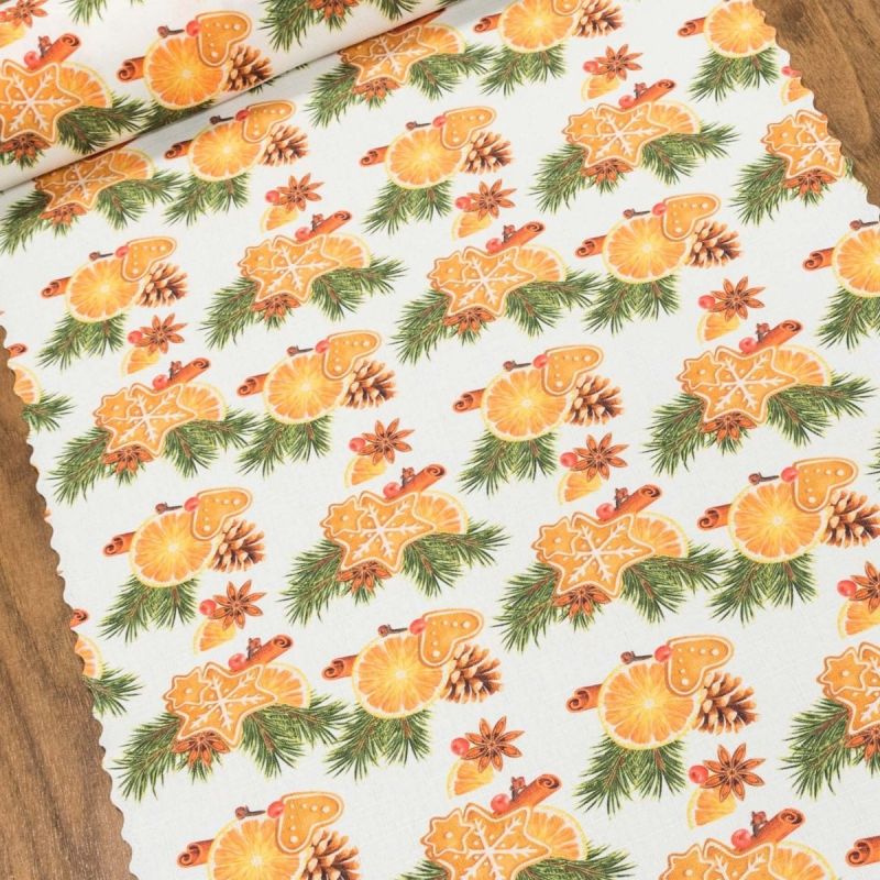 Látková ubrusovina / štola s vodoodpudivou teflonovou vrstvou motivem perníčků v oranžových barvách na smetanovém pozadí s vlnkovanými okraji. Díky teflonové vrstvě se rozlité tekutiny do ubrusu nevsáknou a dají se snadno setřít ubrouskem (neplatí však pro mastnotu). Ubrusovina je vyrobena ze 100% polyesteru a je dostupná v metráži o šířce 38cm, takto široká ubrusovina má využití jako středový pás na stůl nebo také prostírání.