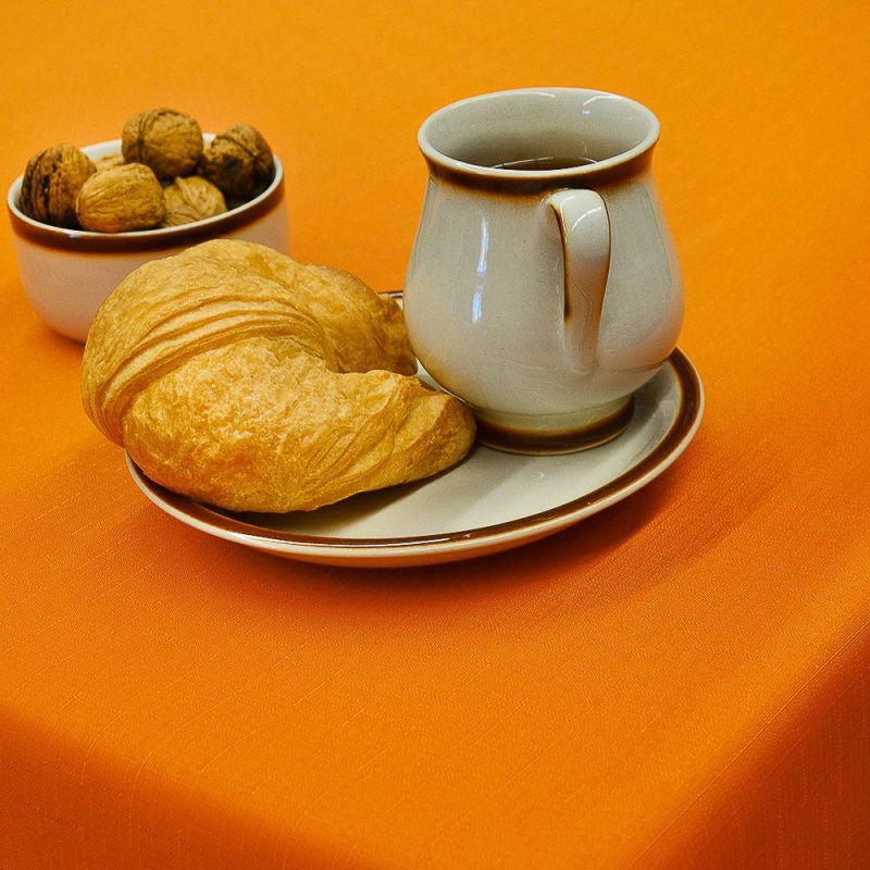 Hotový látkový kuchyňský ubrus s vodoodpudivou teflonovou vrstvou v oranžové barvě s vlnkovanými okraji. Díky teflonové vrstvě se rozlité tekutiny do ...
