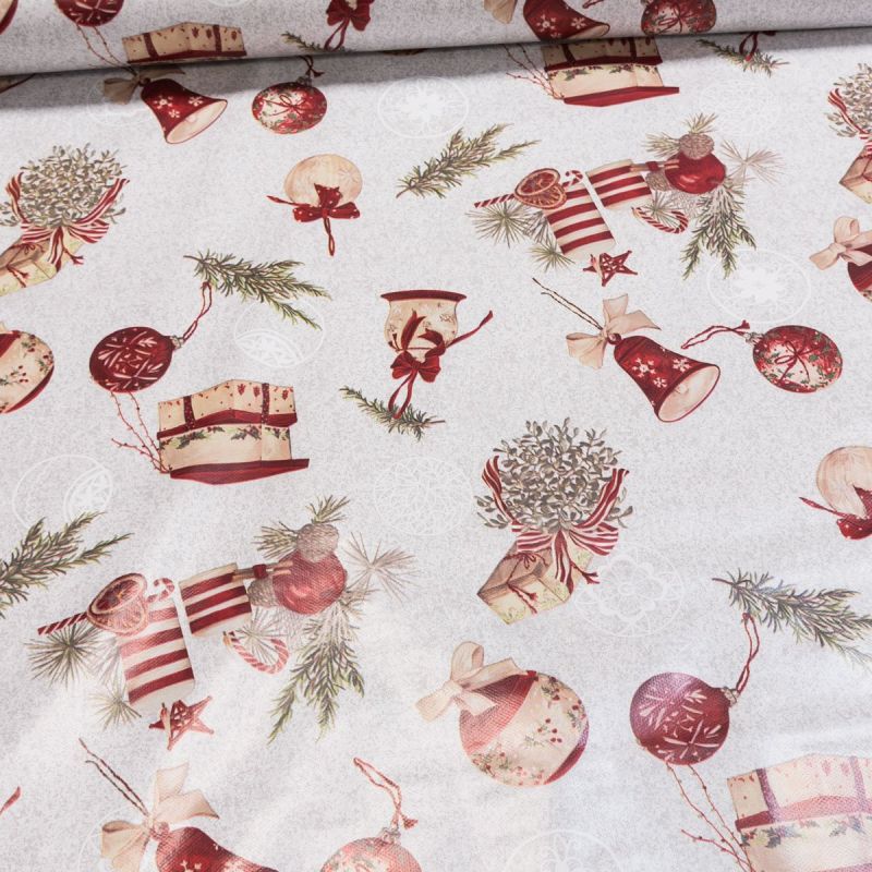 Omyvatelná PVC ubrusovina s podkladem z netkané textilie se vzorem vánočních ozdob v červené barvě na béžovém podkladu s hladkým povrchem. Ubrus je do...