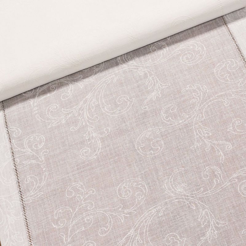 Polyesterová látka (tkanina) štola na metráž ve smetanovém provedení s výšivkou. Látka je v šířce 45 cm, vyrobena ze 100% polyesteru. Látku lze použít na stůl jako jeden středový pruh nebo dva pruhy na šířku stolu nahrazující prostírání.