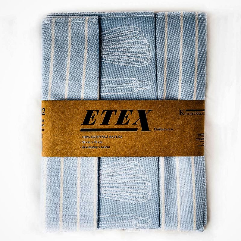 Souprava tří kusů kuchyňských utěrek z exkluzivní egyptské bavlny v rozměru 50x70cm v provedení pruhů a kuchyňských potřeb v modrých barvách....