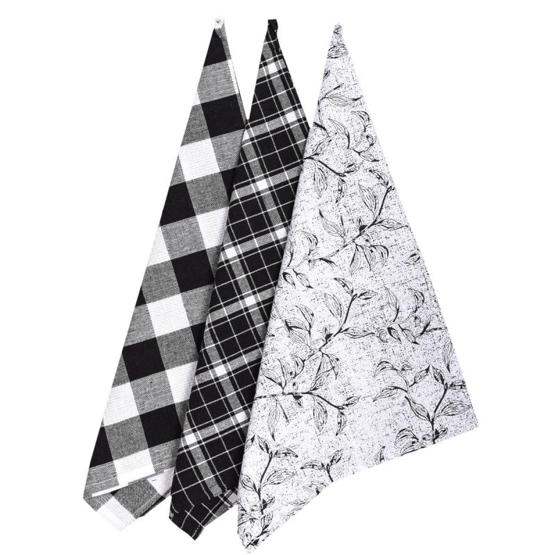 Souprava tří kusů kuchyňských utěrek z 100% bavlny v rozměru 45x70cm se vzorem kára, kostky a lístků v černo-bílých barvách. Sada obsahuje 3 utěrky.