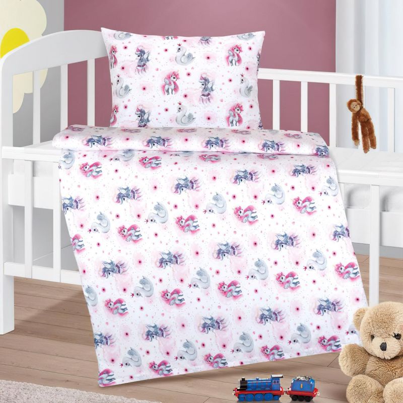 Dětské bavlněné povlečení do postýlky se vzorem malých růžových a jednorožců jednorožců a labutí na bílém pozadí. Povlečení je z obou stran stejné. Souprava je vyrobena ze 100% bavlny a obsahuje jeden povlak na přikrývku 100 x 135 cm a jeden povlak na polštář 45 x 60 cm. Zapínání na zip.