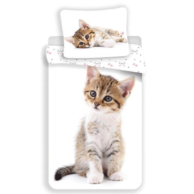 Dětské bavlněné povlečení s motivem roztomilého koťátka na bílém podkladu. Povlečení je oboustranné, z jedné strany je velký vzor kočičky, z druhé str...