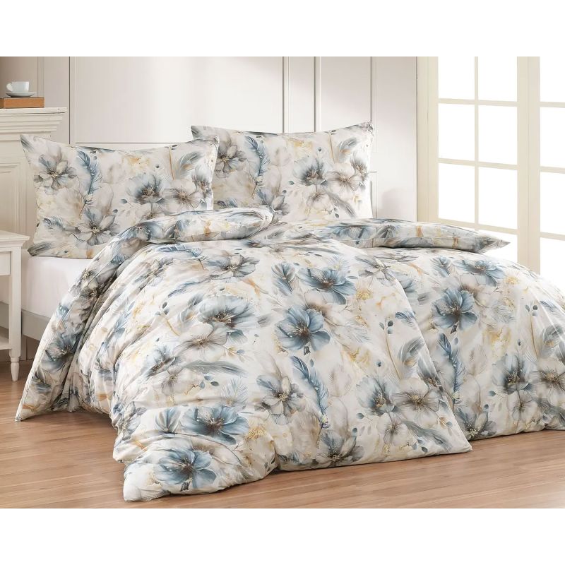 Povlečení Matějovský LOWELL, modré a béžové květy, bavlněný MAKO satén, 140x200cm + 70x90cm