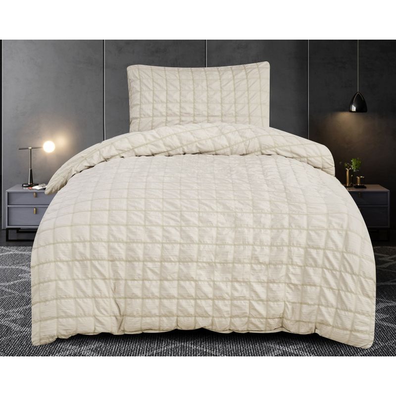 Obláčkové krepové povlečení (též mikrokrep) v béžové barvě vyrobené z kombinaci 65 % polyesteru a 35 % bavlny v gramáži 105 g/m2 se zapínáním na ZIP s jemným kostičkovým vzorem, který vytváří zajímavou strukturu na povrchu látky. Tato krepová úprava má typickou lehce zvlněnou texturu, která povlečení dodává lehkost a vzdušnost. Je proto vhodné nejvíce ne léto. Povlak na polštář 70 x 90 cm a přikrývku 140 x 200 cm je sladěn do jednotného designu pro harmonický vzhled ložnice.