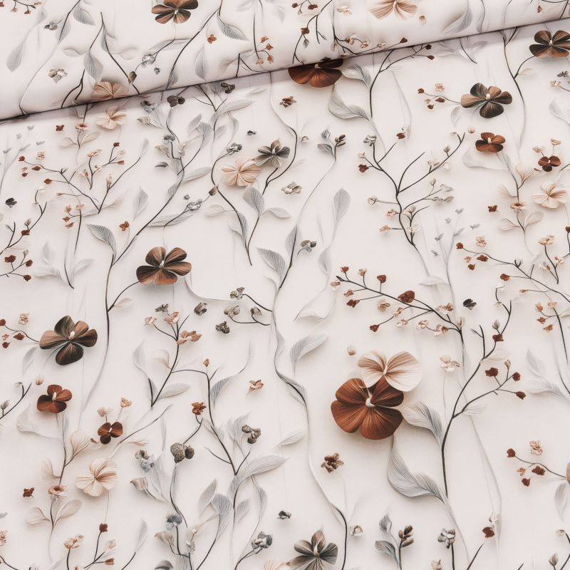 Polyesterová látka (tkanina) s teflonovou úpravou s motivem hnědých květin na béžovém podkladu. Látka je v šířce 160 cm a je vyrobena ze 100% polyesteru s teflonovou vrstvou, látku žehlit z rubové strany. Motiv na látce je pouze z jedné strany, z druhé je látka bez potisku.