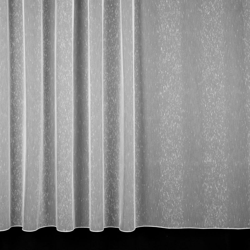 Hotová jemná záclona s drobnými nopkami - vzor prší v bílé barvě, zakončená zátěžovým olůvkem. Záclona je vyrobena ze 100% polyesteru v různých výškách a šířkách. Záclona má z výroby pevné boční kraje a vrch je zapravený řasící páskou obojživelník TZ22 o šířce 7,5 cm s tužkovými sklady a poměrem řasení 1:2, která umožňuje navlečení na tyč, upevnění na háčky i na žabky.