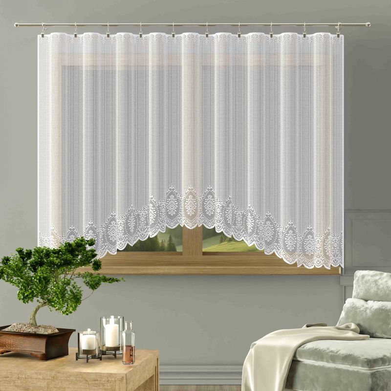 Hotová žakárová záclona se vzorem oválků s ornamenty v jednobarevné bílé barvě, zakončená bordurou. Záclona je vyrobena ze 100% polyesteru v různých výškách a šířkách. Záclona má z výroby pevné boční i horní okraje, bez řasící stužky. Výška záclony je měřena v nejdelším místě.