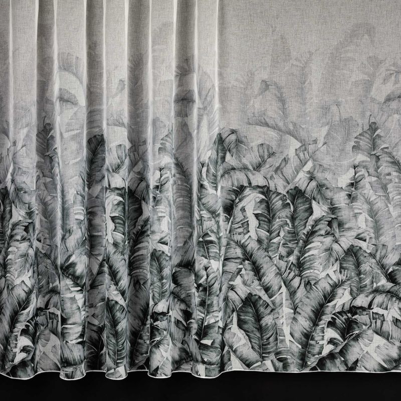 Metrážová batistová záclona / lehká závěsovina se vzorem listů v zeleno-šedých odstínech na smetanovém podkladu, zakončená zátěžovým olůvkem. Záclona je vyrobena ze 100% polyesteru a je dostupná v různých výškách. Výška záclony je měřena v nejdelším místě. Záclonu lze použít i jako velmi lehký dekorační závěs.