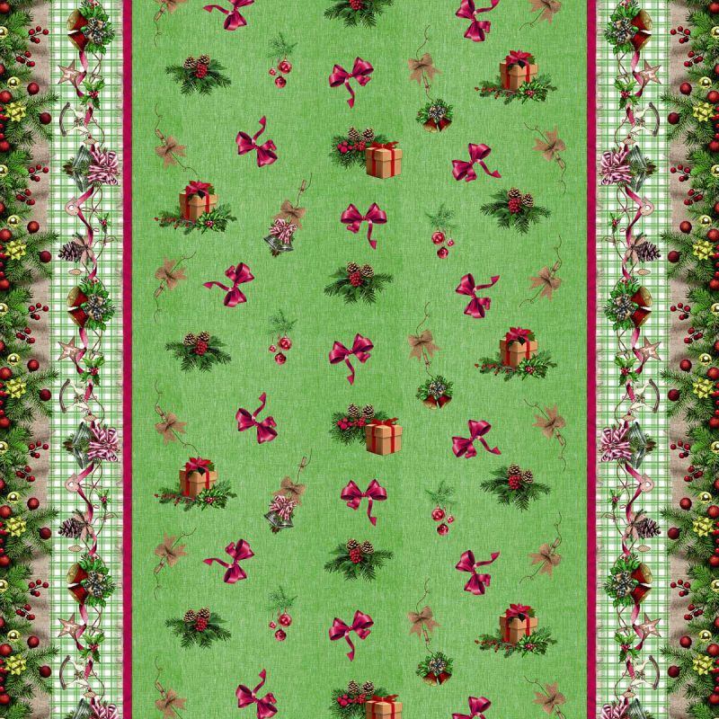 Omyvatelná PVC ubrusovina s podkladem z netkané textilie se vzorem dárků, mašliček, Vánoční organzy a smrkových větviček na zelené barvě s hladkým povrchem. Ubrus je dostupný v metráži o šířce 140cm.