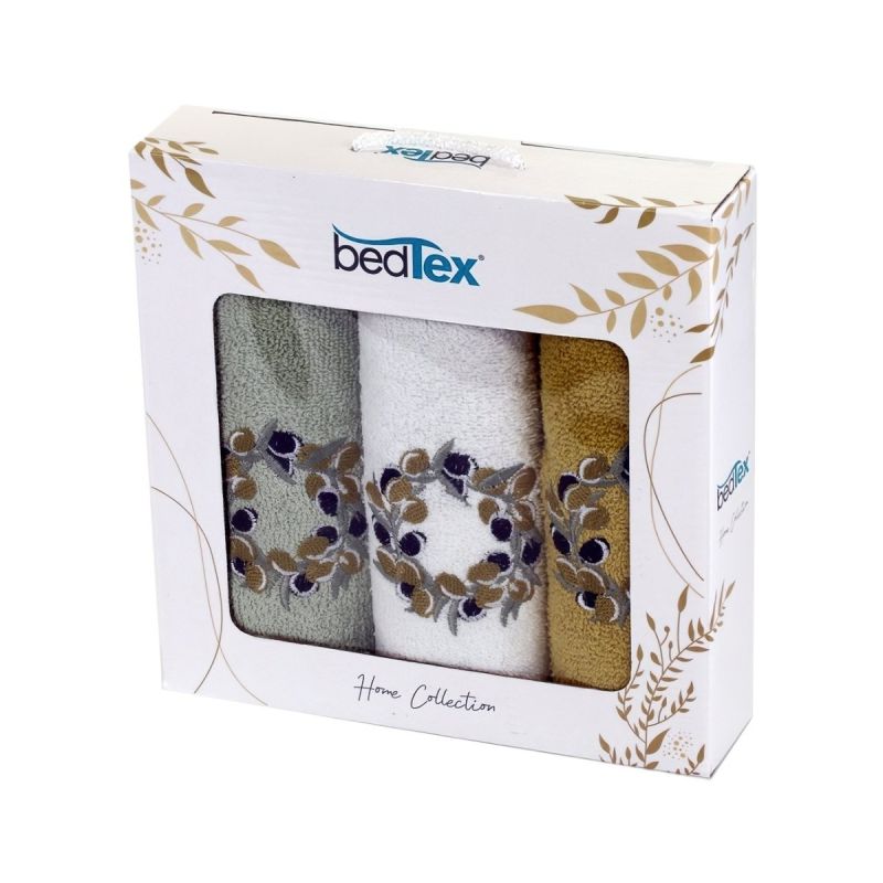 Dárkový set froté ručníků (3x 30x50cm) s vyšívaným vzorem věnečku na bílém, zeleném a hořčicovém pozadí. Ručníky jsou vyrobeny z vysoce kvalitní 100% ...