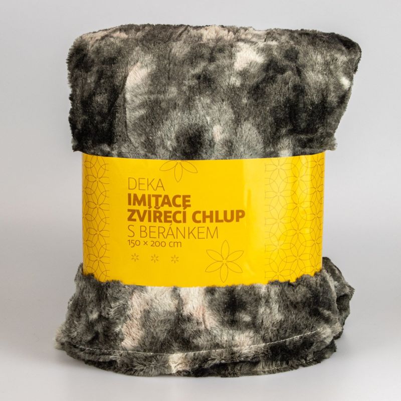 Deka z mikroflanelu (100% polyester) se strakatým tmavě šedým vzorem v imitaci králičí srsti. Přikrývka je z jedné strany hebká a barevná, z druhé strany je beránek. Deka je v rozměru na jednolůžko 150 x 200 cm.