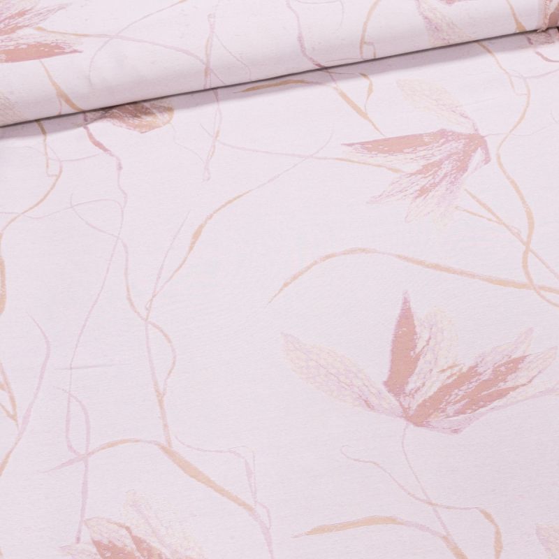 Polyesterová závěsová látka (závěsovina) se vzorem starorůžovo-béžových květů na smetanovém podkladu. Látka má tkanou hrubší strukturu v metráži v ší...