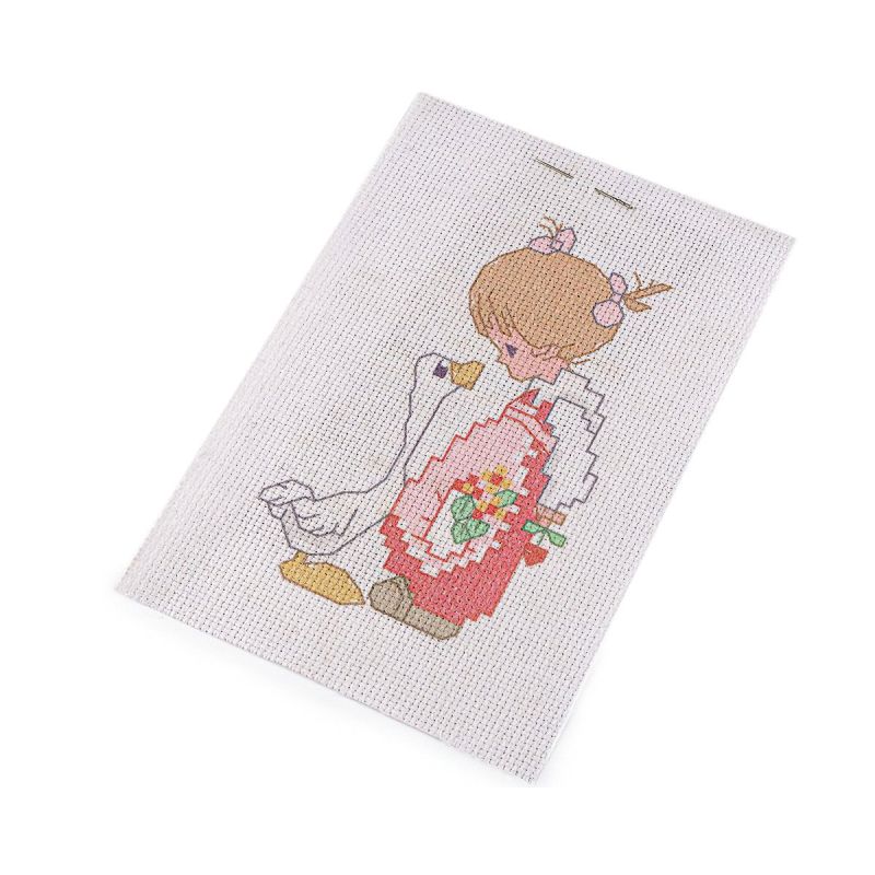 Dětská sada na vyšívání s motivem holčičky a husy. Vyšívá se na předtištěnou tkaninu ze 100% bavlny pomocí přiložené sady nití, nejlepší je však použít příze mouline (mulinka), které nejlépe vyniknou. Vyšívací sada obsahuje vyšívací tkaninu s předlohou, sadu barevných nití a jehlu. Rozměr celého plátna je 14 x 20 cm.